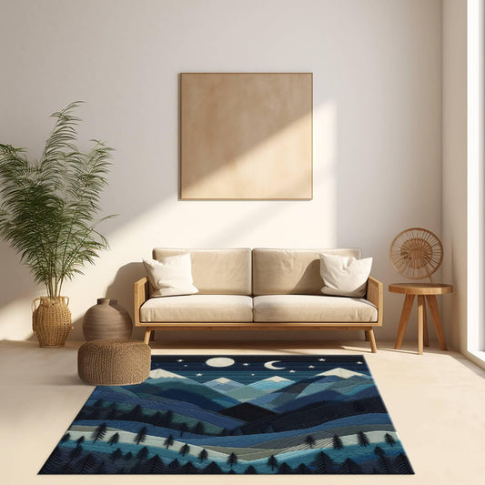 Blue Mountain Landscape Rug, Modern Wall Hanging, Night Sky Art, Nature-Inspired Home Decor, Geometric Textile Art, Unique Handmade Gift,