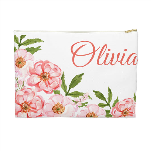 Pink Flower Name Custom Pouch Bag - Personalized Women Accessory Pouch, Makeup Bags, Personalized Women Bag, Initial Pouch, Toiletry Bag