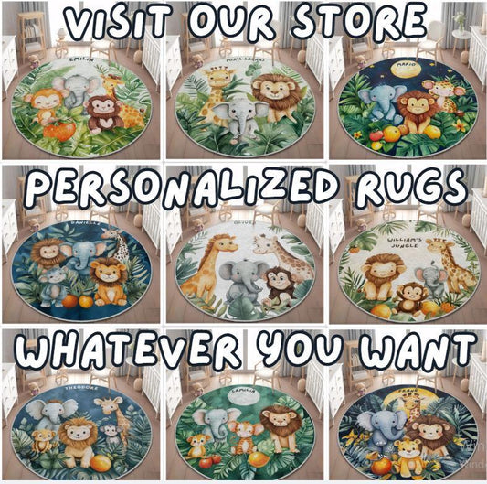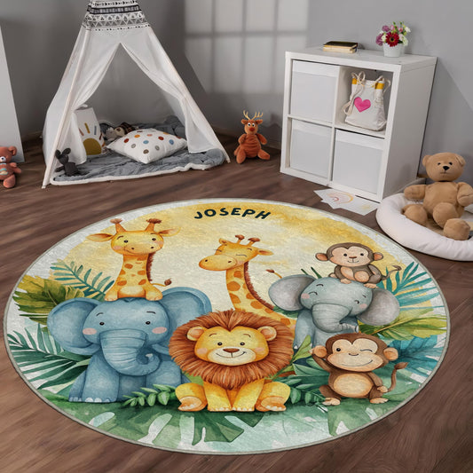 Custom Name Jungle Nursery Mat, Cute Elephant Lion Giraffe Carpet, Baby Room Decor, Kids Playroom Rug, Personalized Safari Animal Round Rug