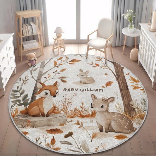 Personalized Woodland Nursery Rug, Custom Name Baby Room Decor, Baby Fox Deer Rabbit Rug, Neutral Baby Gift Carpet, Round Baby Play Mat