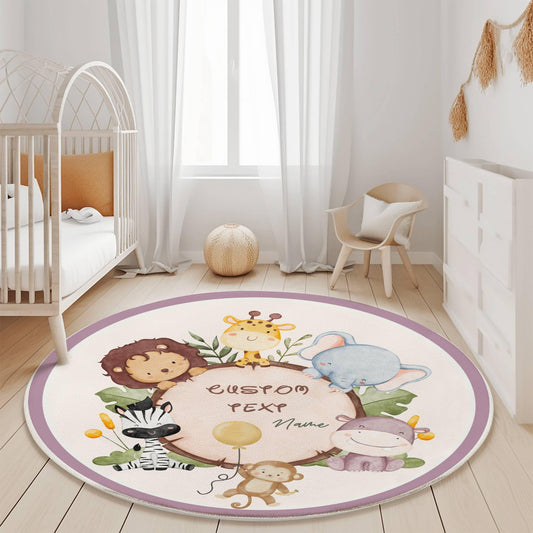 Personalized Kids Safari Round Rug, Custom Name Jungle Play Mat, Cute Animals Carpet for Kids, Nursery Room Decor, Baby Shower Gift Rug