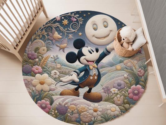 Mickey Mouse Nursery Rug, Disney Round Rug, Nighttime Scene Rug, Floral Design Mickey Rug, Soft Kids Play Mat, Baby Room Decor, Baby Shower