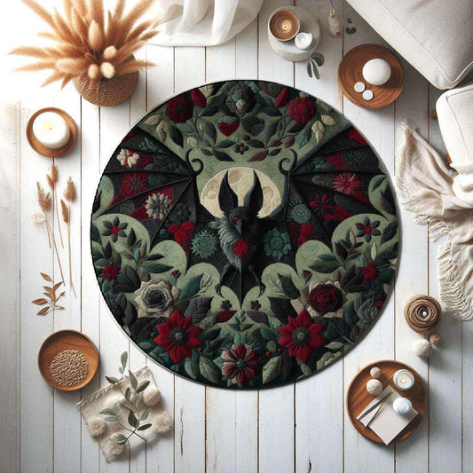 Gothic Bat Rug with Red and Green Floral Botanical Design, Gothic Rug for Home Decor, Gothic Themed Carpet, Living Room Rug, Round Goth Rug