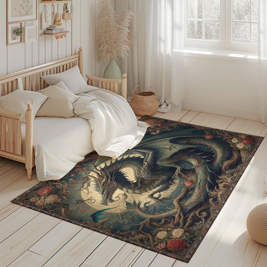 Fantasy Dragon Rug, Victorian Gothic Enchanted Rug, Medieval Rug, William Morris Style Rug, Gothic Home Decor, Fantasy-Inspired Floor Rug