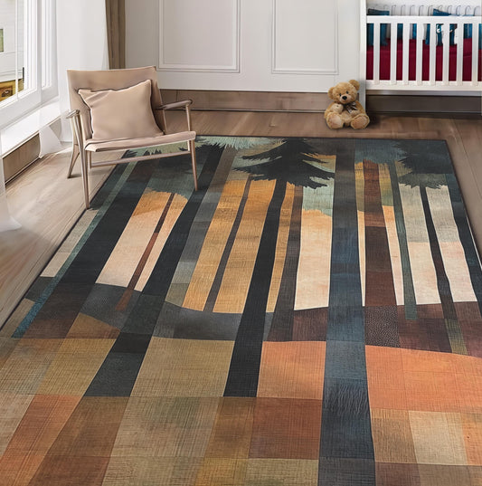 Forest Rug, Woodland Carpet, Tree Silhouette Area Rug, Patchwork Woodland Rug, Landscape Floor Decor, Modern Cabin Rug, Jungle Carpet