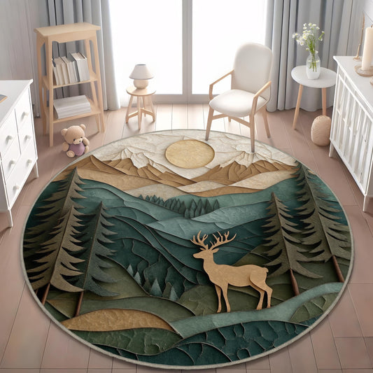 Forest Deer Round Rug - Woodland Nursery Rug - Mountain Scene Area Rug - Deer Forest Rug for Nursery - Round Nature Inspired Kids Rug